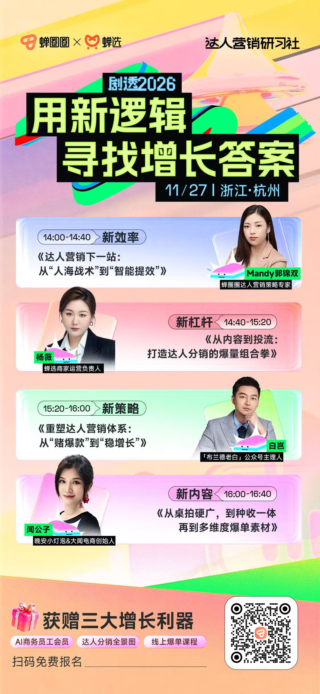 《达人营销增长体系全景图》2026年版将于 11月27日 在 杭州 的线下专场中首次发布并做深度解读。