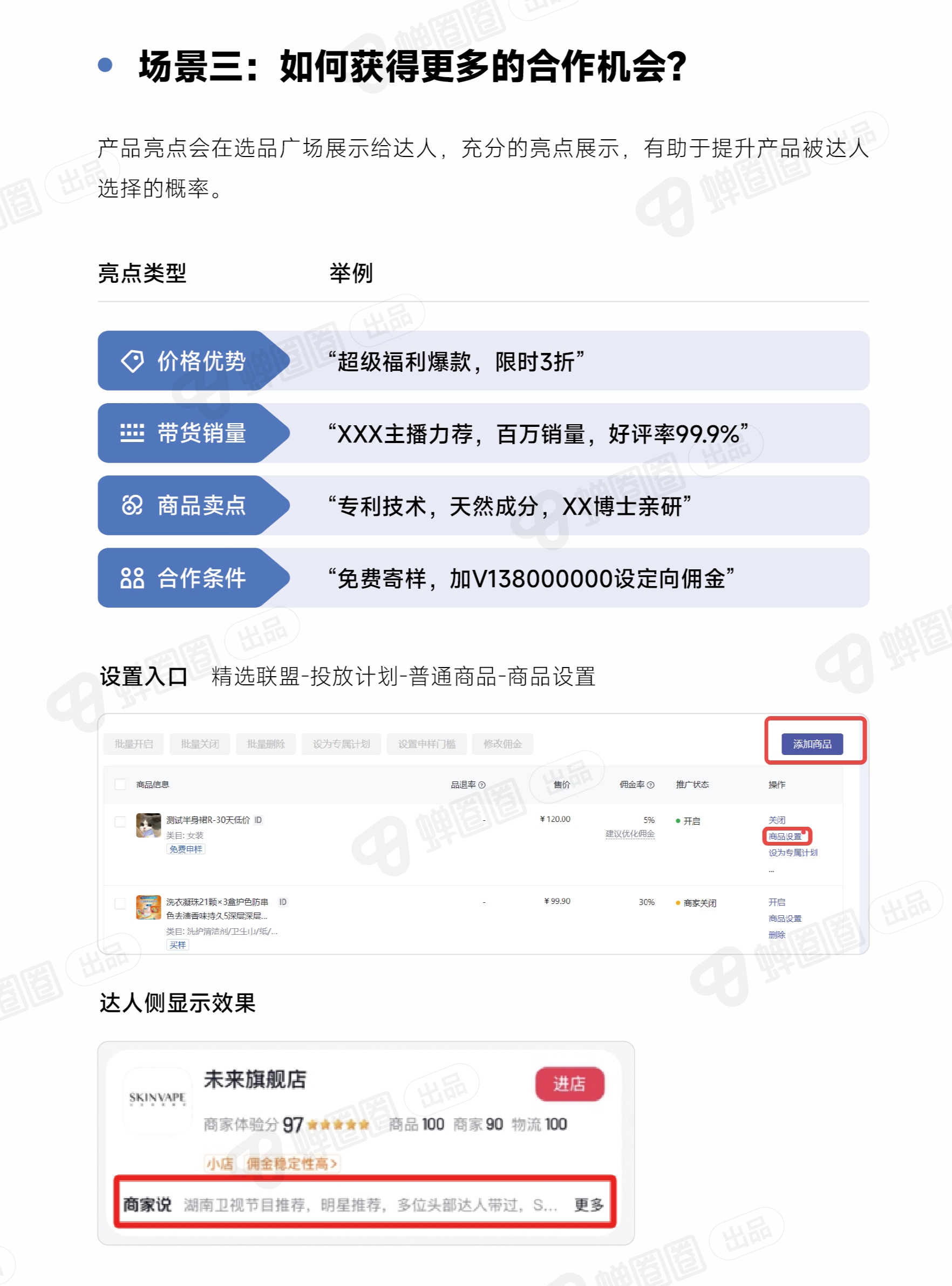 - 在精选联盟中,为你自主投放的商品精心设置 【商家说】。