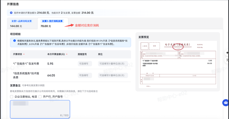 平台将据此分别开具91.5万元的技术服务费发票和8.5万元的广告费发票。