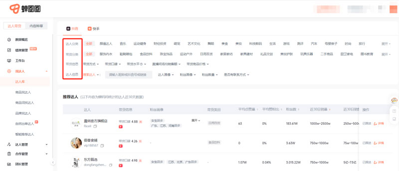 这里推荐使用蝉圈圈的找达人功能,可以从达人分类、带货偏好、达人的粉丝画像等多维度筛选出匹配达人,还能查看达人详情,了解达人带货过哪些品牌、产品、带货口碑等。