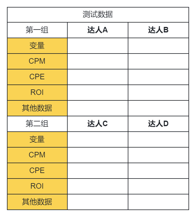 例如,根据产品得出,我们需要测试种草类达人和剧情类达人的人群效果,可以固定所有影响因素,更换达人类型进行投放,然后收集数据后进行分析。