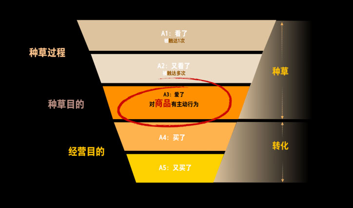 抖音官方提出了o to 5A的定义,描绘了消费者距离购买的远近关系:如果他刚看到品牌A的产品,他并不想买的时候,他只是A1人群;随着他不断地观看到品牌A的相关视频,有过多次触达叫A2人群;随着更深入的触达,当消费者看到的频次足够高,且开始主动搜索、关注商品,它就变成了A3种草人群,那就离下一步A4购买和A5复购不远了。