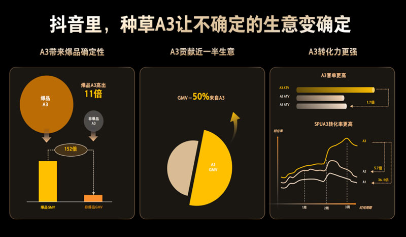 可见,在抖音里,A3贡献了近一半的生意,种草A3就是将不确定型的流量变成确定性。