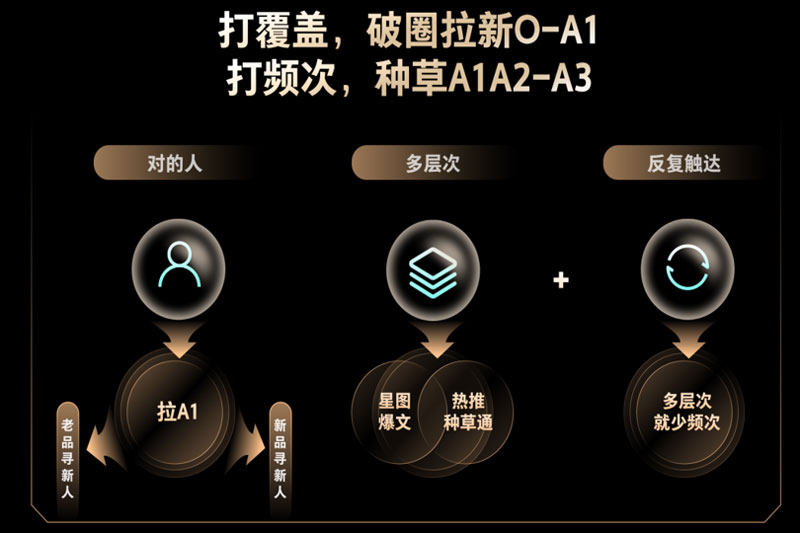 所谓种草,其实就是找浅层的人群,只需要不断的让产品被看到,被看的频次越多,种草就越深。基于抖音兴趣平台的特性,品牌要通过不断的内容植入,像狗皮膏药一样粘住消费者,产品才会深入人心。于是巨量提出了一个论点,生意增长其实人群资产增长,也就是品牌的A3和A2的人群储量是新品打爆的核心保证。所以打爆新品的重点第一步绝对不是换回来深层次的行为数据,而是要种草A3。