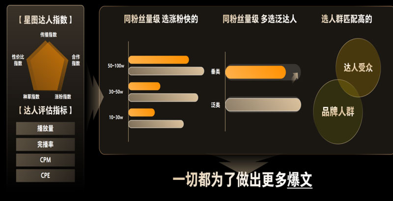 为什么要推广?举个例子,一个达人可覆盖100万流量圈,但100万有限,所以品牌找到了3个达人,覆盖了300万的流量圈,但品牌犹觉不足,于是用推广就能把这个圈放大到1000万以上。