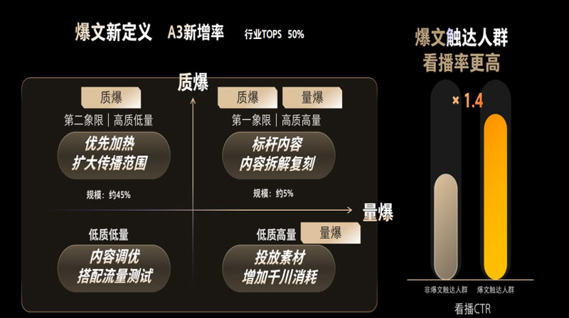 千千老师给出两个定义,质爆与量爆。质爆就是单条视频拿到的A3数量多,量爆是单条视频拿到的播放量大。然后根据这两个维度把视频分为四种并给出对应的建议: