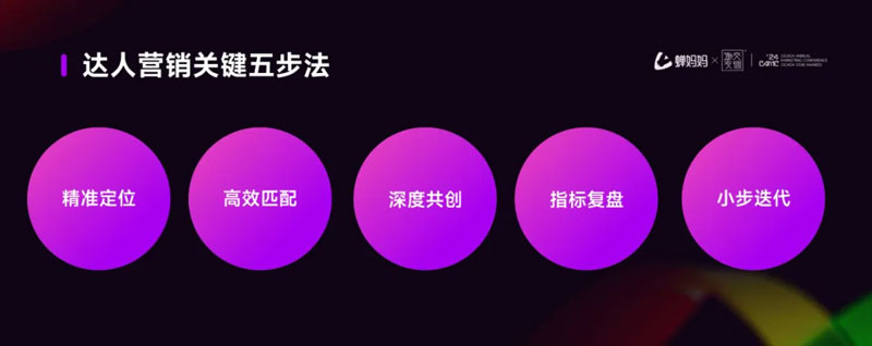 经过实操落地后,交个朋友内部重新定义达人营销分成五个步骤,这五个步骤分别是精准定位、高效匹配、深度共创、指标复盘、小步迭代。并严格要求团队成员做每一次业务推演的时候要强化方法论。