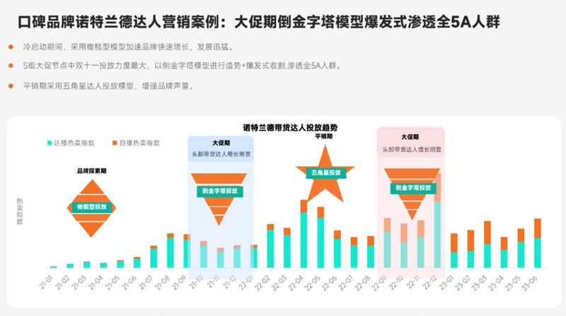 我们发现,现在很多品牌(例如诺特兰德)已经不单单是单个达人的合作群体,更多是达人矩阵的合作群体。从新品的爆炸、产品的种草、持续的渗透、决策的支持,到消费的转化和长尾的沉淀,实际上需要超头部达人、头部达人、中腰部达人和尾部达人一起来合作。
