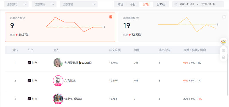 在使用蝉圈圈之前,芊小白每周都要动员所有人去做盘点,接入蝉圈圈之后,不仅可以清晰每个进度,还能自动收集数据做分析,什么商品卖得好,哪个达人贡献大,哪个商务业绩强,统统一目了然。