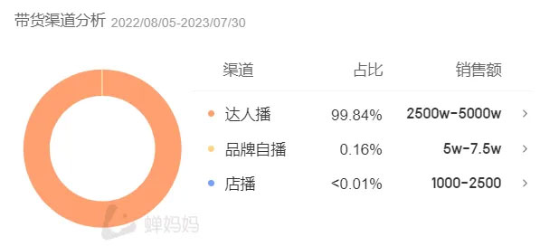 从带货渠道可以看到,其在抖音的销售额主要由达人贡献,占比高达99.84%。