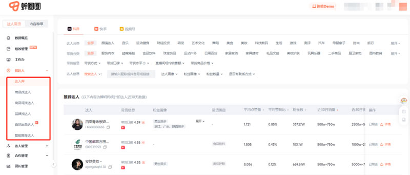 蝉圈圈支持抖音、小红书、快手、视频号等主流平台的达人营销管理,一站式管理多平台的达人筛选、合作管理、效果追踪,加速营销布局,洞察营销情况。