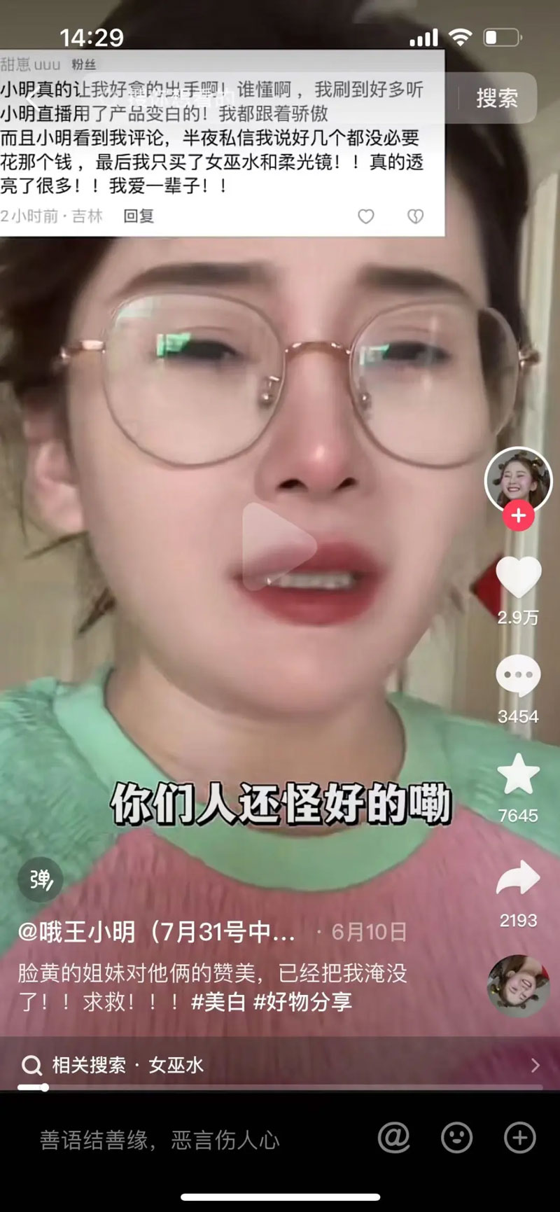 针对女巫水,AB.LAB主打“美白”,例如与哦王小明合作,短视频围绕“美白”创作的“15天美白挑战”为产品前置种草,直播输出上紧扣“美白”标签,单场直播就能成交250万-500万的GMV。
