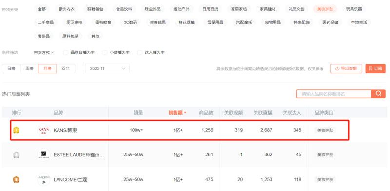 通过蝉妈妈可以看到,在刚过去的11月,韩束的399元红蛮腰礼盒在抖音售出了50万-75万件,销量排行护肤商品榜第三。全品牌累积销量达100万,累积销售额破亿,品牌排行美妆护肤榜单第一,超过雅诗兰黛、兰蔻、珀莱雅、欧莱雅、极萌等品牌。