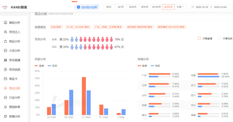 以@姜十七为例,视频的受众主要是18-30岁的女性,地域集中在广东、河南、四川,和韩束画像重合度高。