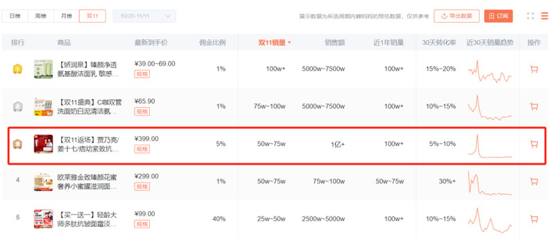 且大促推出的礼盒,借助自带流量的营销热点,从而提升产品和品牌的销量和声量。由此,今年双11该礼盒销量50万-70万,累积销售额超1亿,位列双11护肤品商品排行第三名。