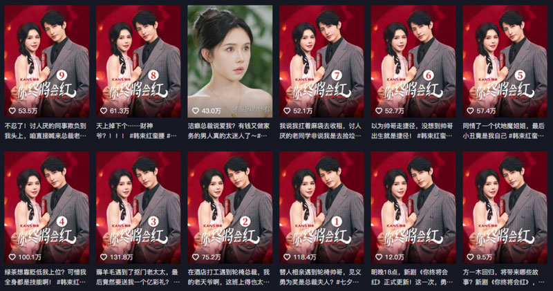 例如,与@姜十七合作了《你将会红》(9.4亿播放)、《以成长来装束》(6.4亿播放)、《心动不止一刻》(11.9亿播放)、《一束阳光一束爱》(11.4亿播放)等多部短剧,在每集都植入红蛮腰的广告。