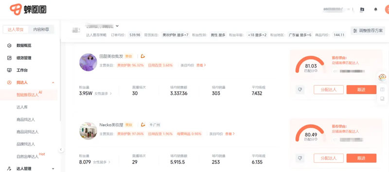 蝉圈圈智能推荐达人功能,设置了画像之后,便会利用大数据算法,推荐相似的适合品牌的出单达人,商务无需大海捞针找达人,只需根据蝉圈圈的推荐比对需求确定达人,且还能对达人进行评价,合适的跟进,不合适的删除,长此以往,系统推荐的达人就会越来越准,让商务一上班即可建联,大大提升找达人的效率。