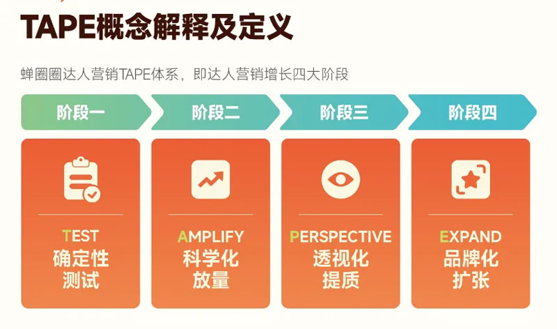 蝉圈圈达人营销专家研究过8000个服务品牌,提炼了蝉圈圈达人营销TAPE体系,该体系阐述了品牌做达人营销会经历四个阶段: