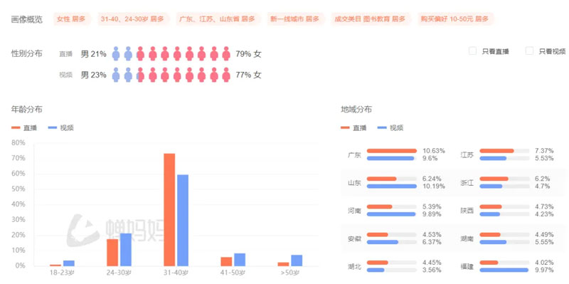 根据蝉妈妈显示,斗半匠的购买人群画像为居住在广东、山东、江苏几个教育大省,30-40岁的女性为主。