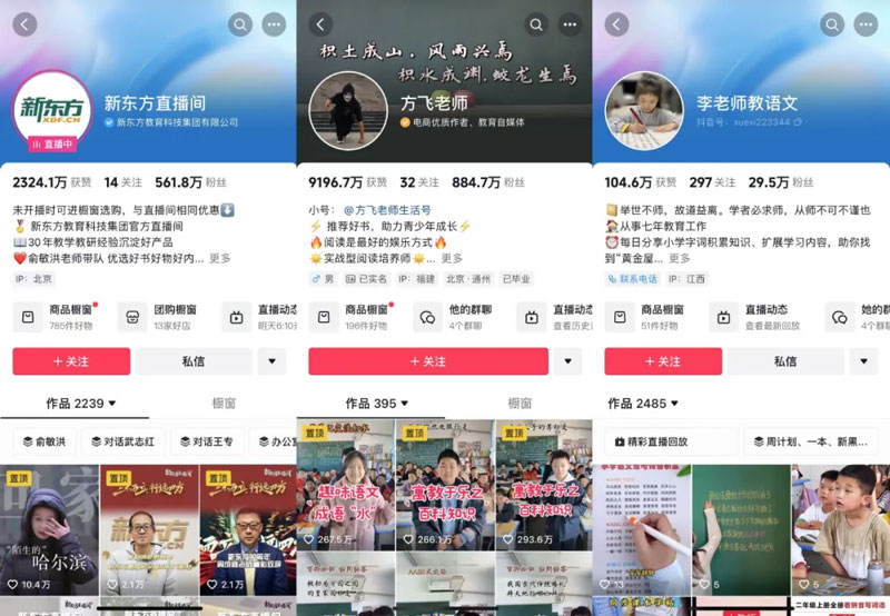 这类达人具有丰富的经验,大部分都有老师的身份,例如李老师教语文(29万粉)、花花老师讲学习(523万粉)、大芳老师(16.7万粉)、方飞老师(885万粉)、新东方直播间(561万粉)、与辉同行(2329万粉),其中不乏一些头部达人,通过合作头部达人提升用户对产品的信任,实现产品破圈。