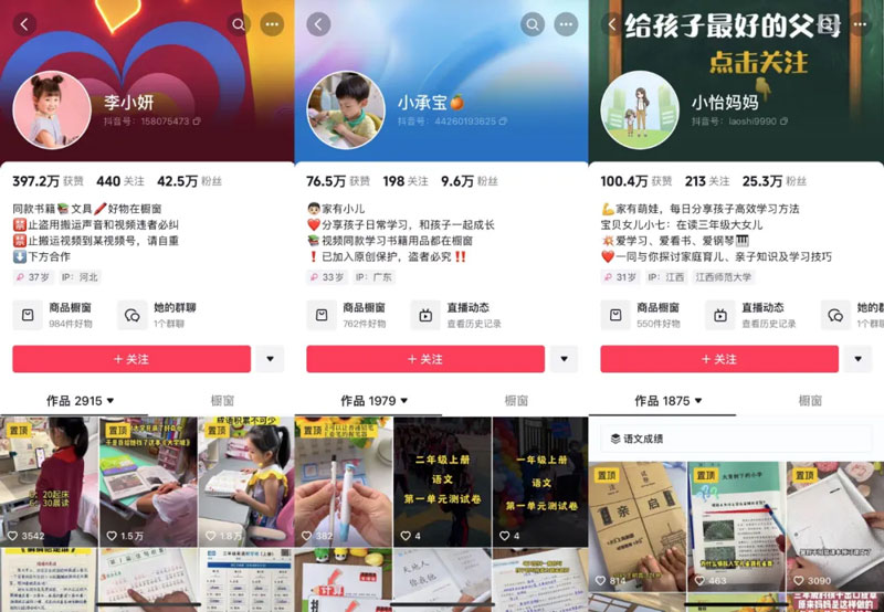 儿童账号突出日常生活、学习趣事,打造儿童IP,例如彤彤的学习日记(24万粉)、小承宝(9万粉)、米小芮(19万粉)、小福星同学(9万粉)。