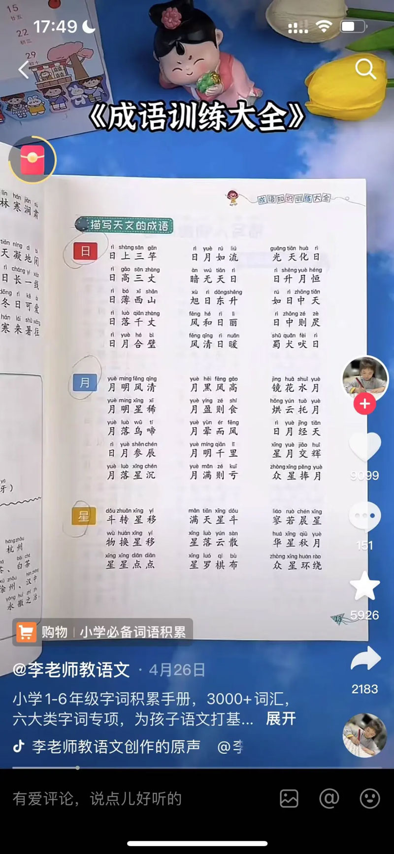 再配合翻教辅的视频画面和儿歌充当背景音乐,这条视频卖出了1万~2.5万册《词语积累手册》,获得了100万~250万销售额。