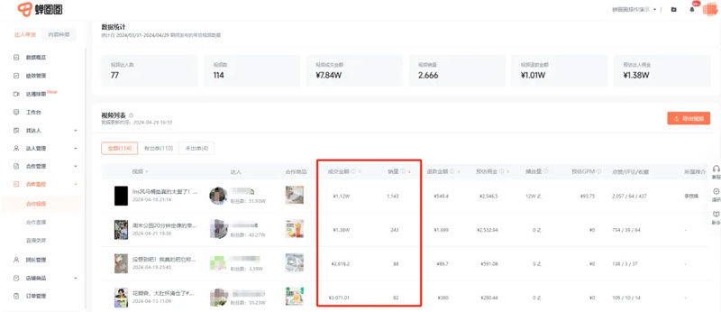 通过合作视频监控,可直达达人抖音作品链接,且直观地统计【有出单】达人的成交金额与具体销售数据,快速掌握爆款,自动快速复制,铺开营销面。