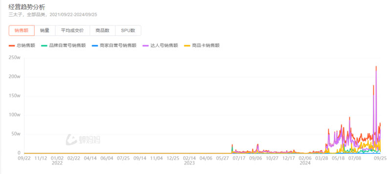 例如,k总,颜值博主搞抽象,2024年8月起,粉丝量一路飙升,从100万粉丝暴涨至1400+万,主要带货食品饮料和日用百货,其从9月20日开始为三太子带货,至今贡献了100万~250万的销售额;