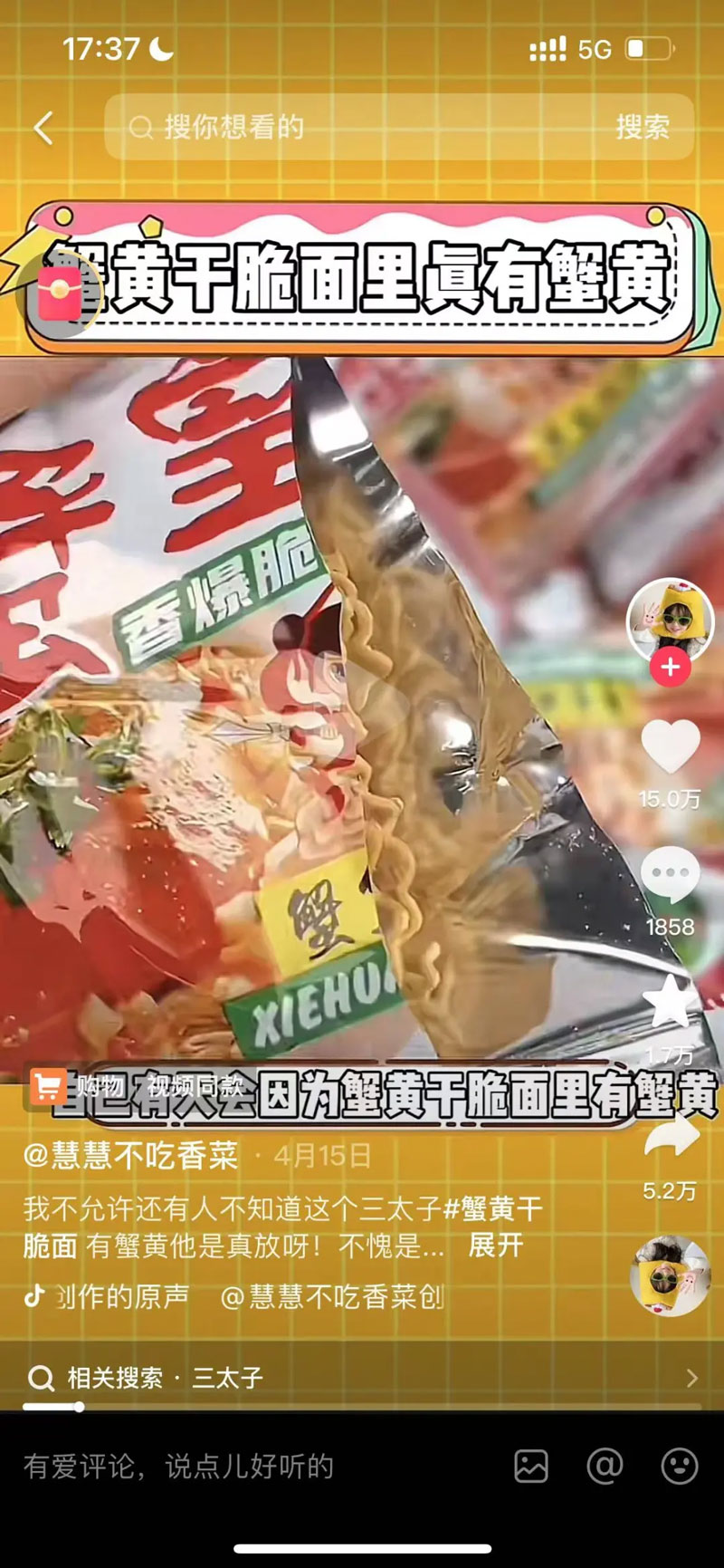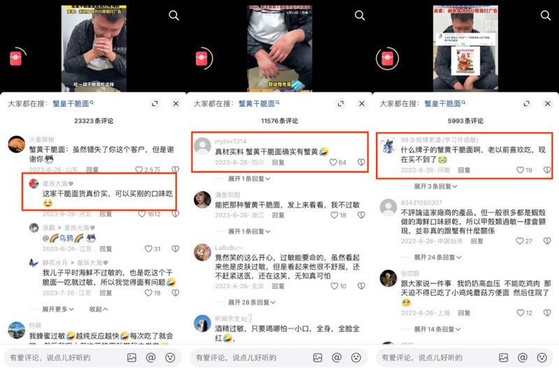 2023年6月,一男子在抖音发布视频,其朋友嘲笑他吃个干脆面也能过敏,因为该男子海鲜过敏,而吃的是蟹黄干脆面。一时之间,评论区的网友纷纷表示“真材实料”“哪个品牌的干脆面”。