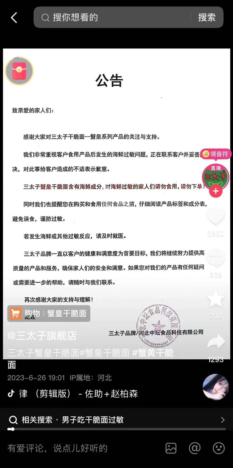 三太子顺势发表声明,“三太子蟹皇干脆面含有海鲜成分,对海鲜过敏的家人们请勿食用,请勿下单”。