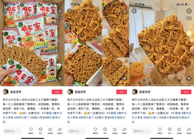 “三太子怎么也没想到自己有一天会因为蟹黄干脆面里有蟹黄而出圈。”——制造事件,用黄金3秒引起好奇,吸引用户继续往下看;