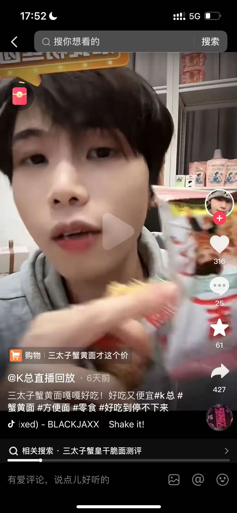其在2023年初开始布局抖音,最开始只是发发素牛肉点心面的视频,主打“辣条+干脆面结合”,但销售表现比较一般。