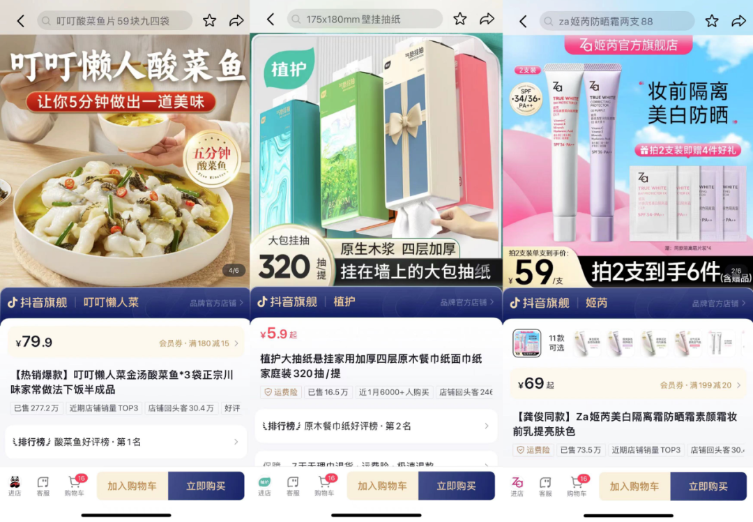 叮叮懒人菜的酸菜鱼、植护的抽纸、ZA的隔离霜……