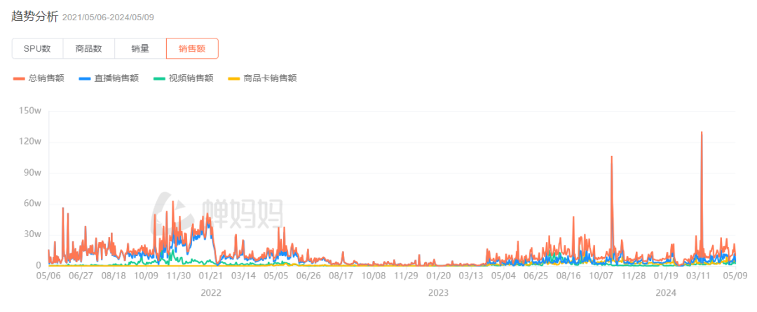 下图为品牌A在抖音的销售额曲线,可以看到销售额起起伏伏,2022年后半阶段经历了一段沉寂,但到2023年再次布局的时候,成绩也不如2021年,品牌的销售额始终没有突破性增长,甚至存在下降趋势。