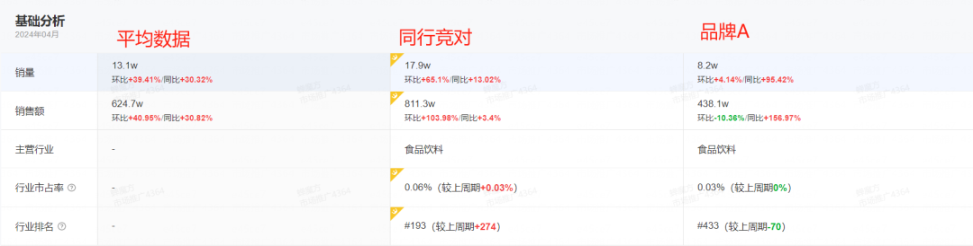 与此同时,同行的销售额持续上升。截取了2024年两个品牌在抖音上的情况,可以发现无论是销量、销售额、市场占有率还是行业排名,同行都在增长,但品牌A好几个数据都“绿”了。