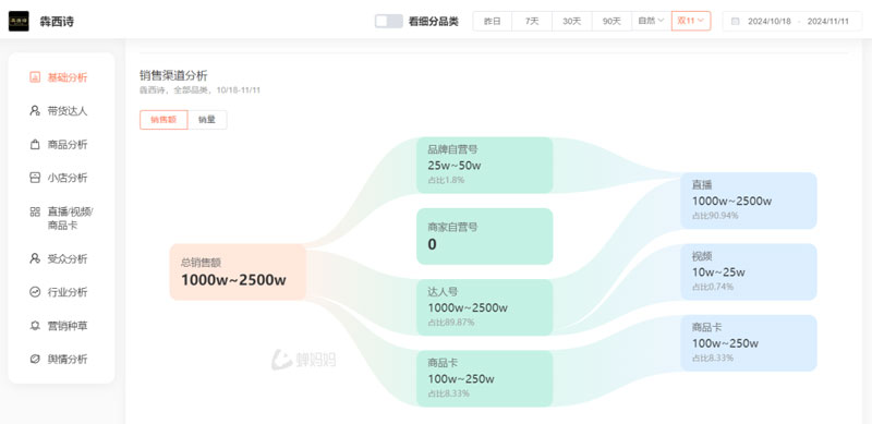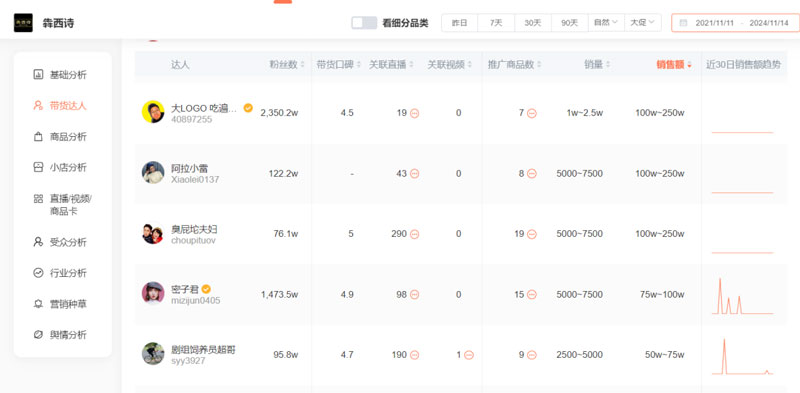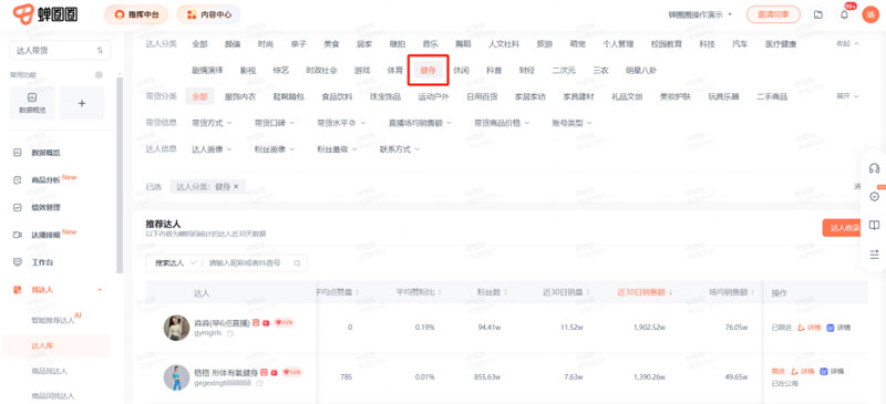 使用蝉圈圈【达人库】功能,可以选择达人分类,查看达人的粉丝画像、粉丝数据、近30天销售额等信息,从而筛选出圈层标杆达人。