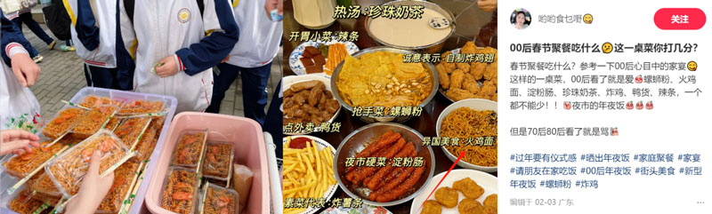 除了在吃播领域备受青睐,小学生们大排长龙的摊位上,在所谓“00后年夜饭”的菜单中,从不缺席火鸡面的身影。它既可以是孩子们解馋的零食,也能成为年轻人餐桌上的独特美味。