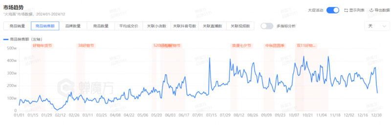 据蝉魔方(蝉妈妈旗下品牌增长策略服务平台)显示,2024年,火鸡面在抖音平台上的销量同比增长了121%,商品销售额呈现逐步上升的趋势。