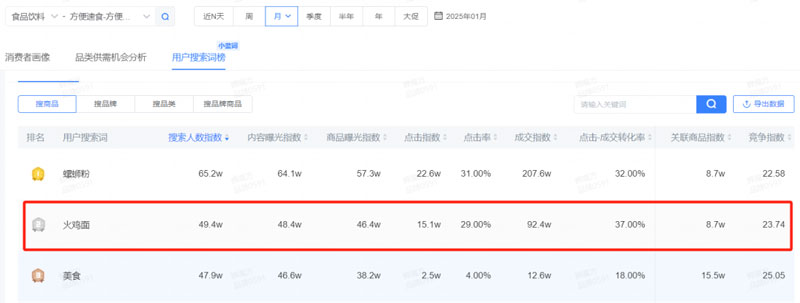 在方便速食的用户搜索词榜中,火鸡面成为了仅次于第一名的热门搜索词,这充分说明了火鸡面在市场上的高关注度和强大的流量基础。