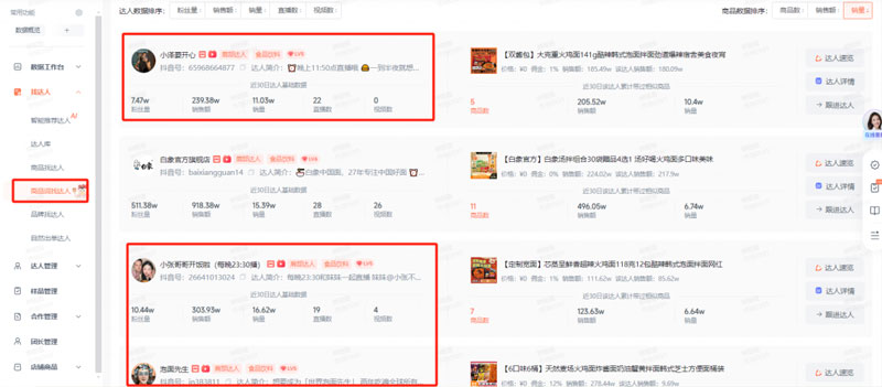根据蝉圈圈(蝉妈妈旗下达人营销智能决策与管理平台)的【商品词找达人】功能,以【火鸡面】为关键词,搜索出相关带货达人,发现销量排名前几的达人大部分都与芯蒸呈合作过,且都是其达人营销的“主力选手”。