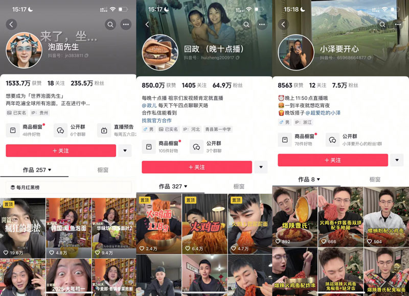 例如:“吃遍全球所有泡面的@泡面先生”,凭借其丰富的泡面品尝经验和专业的讲解,吸引了大量粉丝关注;自称火鸡面仙人的@回政,以其对火鸡面的深度热爱和独特的吃播风格,成为了火鸡面领域的知名达人;一到半夜就想吃宵夜的@小泽要开心,抓住了深夜观众容易产生食欲的心理,在深夜直播吃火鸡面,效果显著。