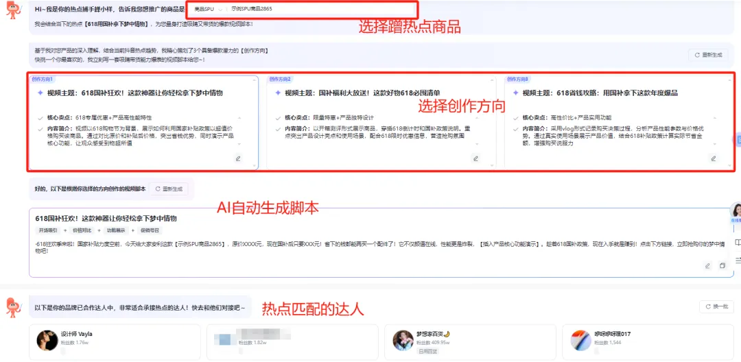 通过【行业热点洞察】功能,系统依据家清行业特性,智能筛选S/A/B级热点,并利用AI生成创意脚本,同步匹配擅长相关领域的达人资源。