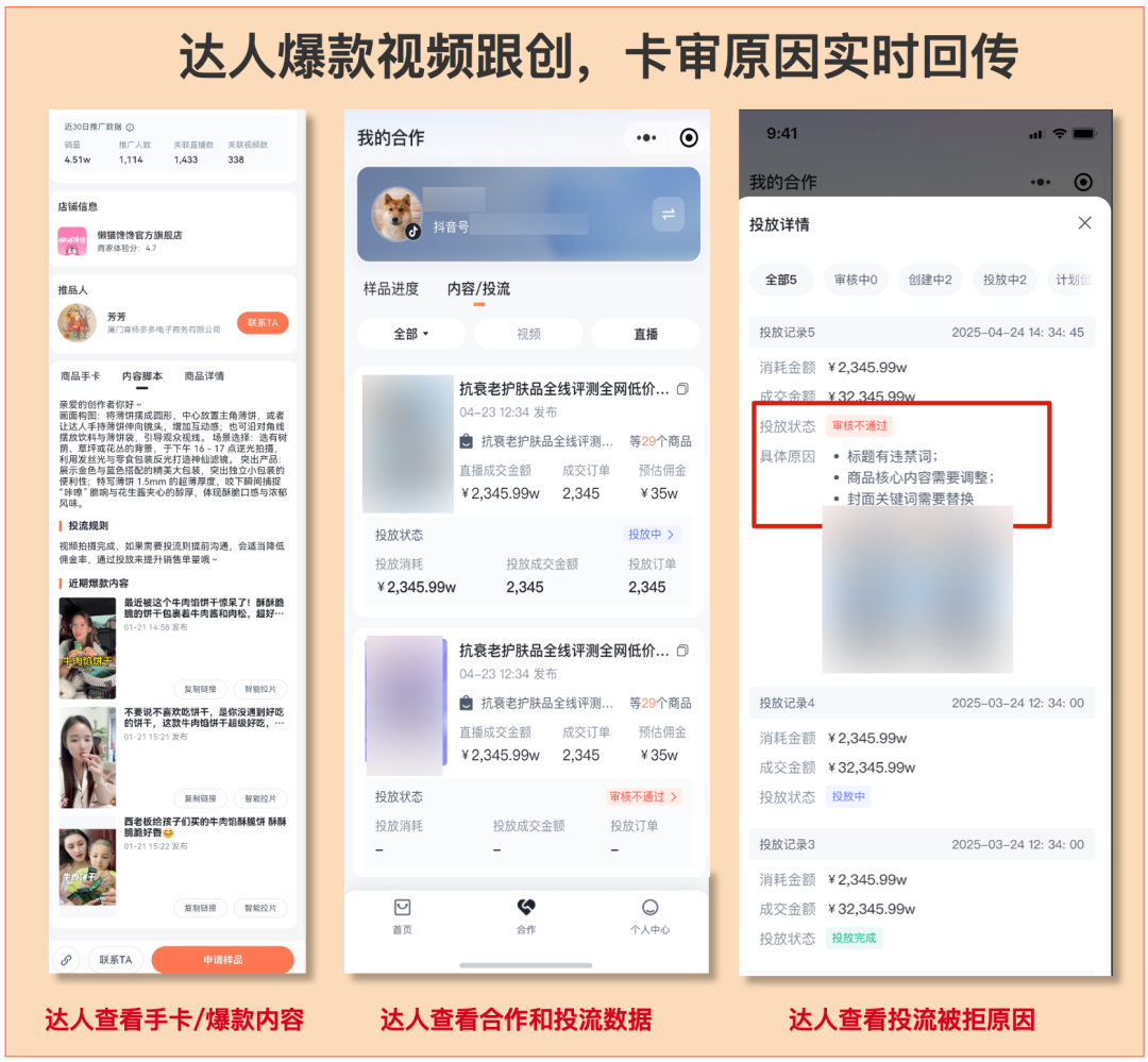 【爆款视频,提炼跟创】提供对应商品的爆款内容,提炼脚本框架,帮助其他合作达人快速跟创,再次打爆。