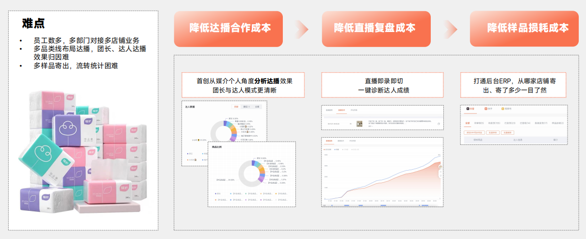 某日用品牌则受益于蝉圈圈“绩效归因快 + 直播复盘快 + 寄样流转快”的特性,绩效统计效率提升185% +,复盘效率提升255%,寄样流转效率提升170%。在样品管理环节,快速的绩效归因和直播复盘能够及时分析样品投放效果,为调整投放策略提供数据支持。这使品牌在达播合作、直播复盘和样品损耗等方面有效降低了成本,实现了更科学的成本管理。
