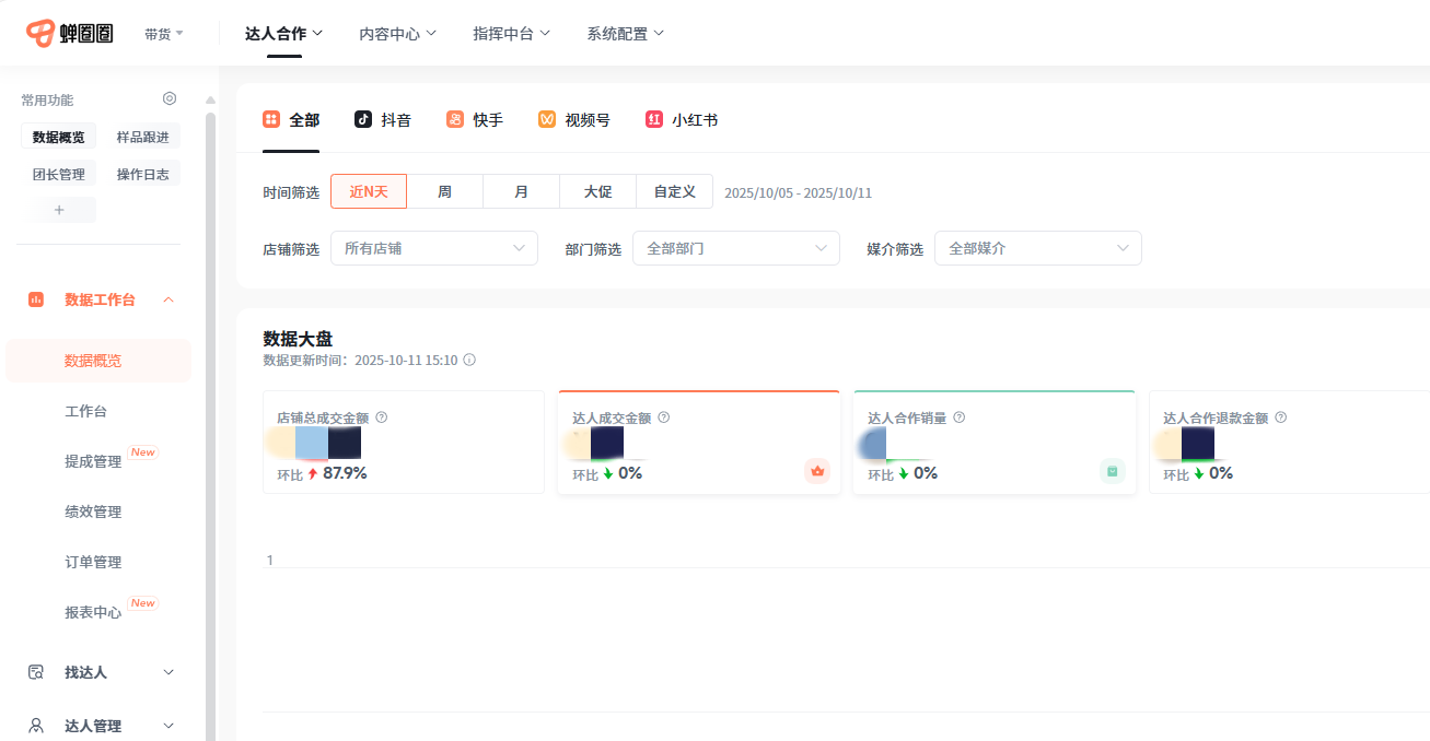蝉圈圈支持抖音、快手、小红书、视频号等多个主流平台,实现跨平台数据整合。品牌无需在多平台间频繁切换,即可全面掌握达人动态,显著降低了运营复杂度与人力成本。