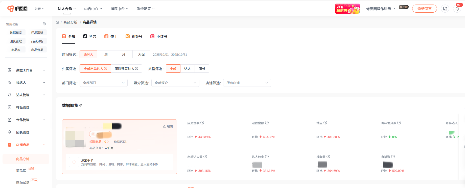 实时监控:自动追踪达人内容曝光量、互动率、成交金额等关键指标,生成ROI预测模型。可跨平台追踪商品单链的成交金额、达人带货等核心数据,助力品牌实现数据驱动的达人营销精准决策。