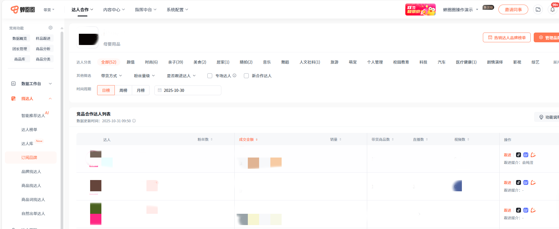 竞品追踪:支持通过输入竞品商品名称,实时关注竞品动态,快速检索与该商品合作过的达人列表,并分析其合作频次、内容形式、带货效果等数据。