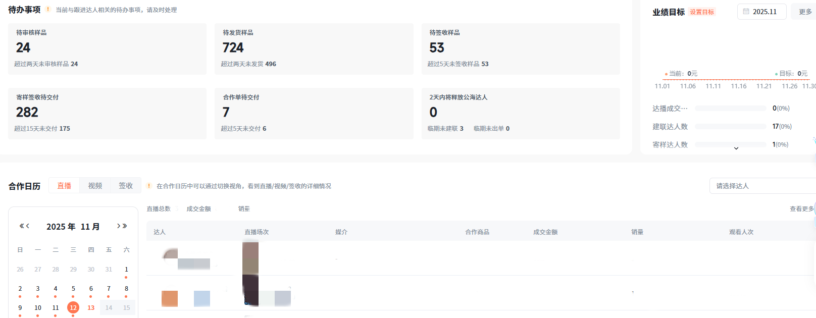 - 一眼看清全局:所有达人的直播、视频发布、样品签收日期,在日历上会被清晰展开。